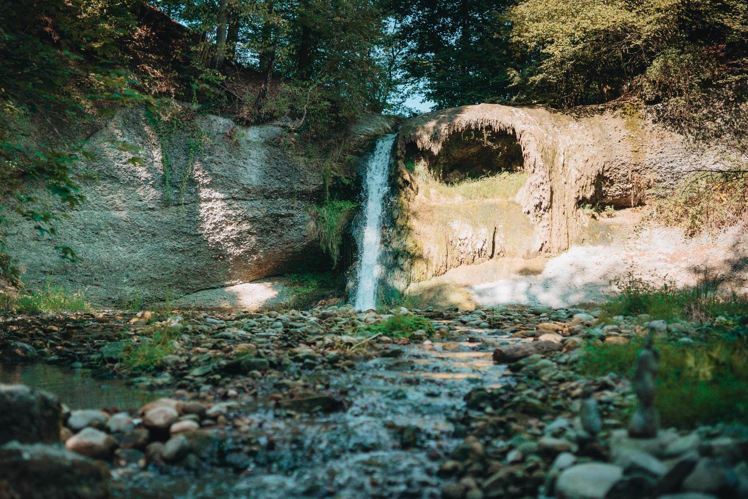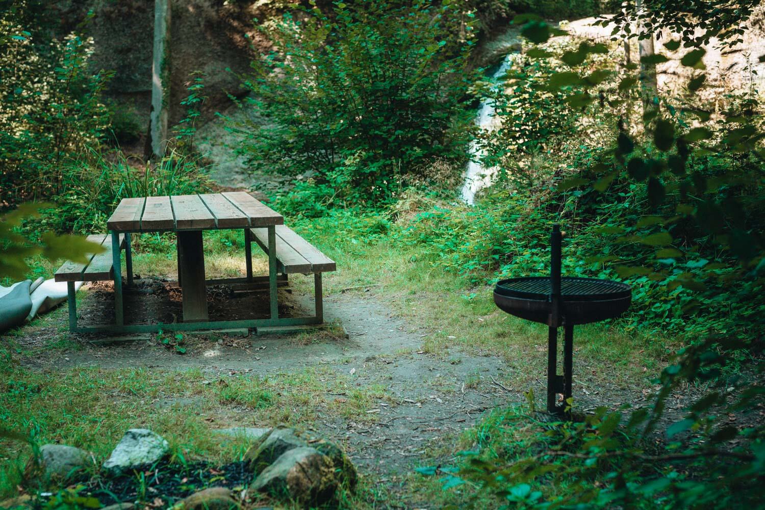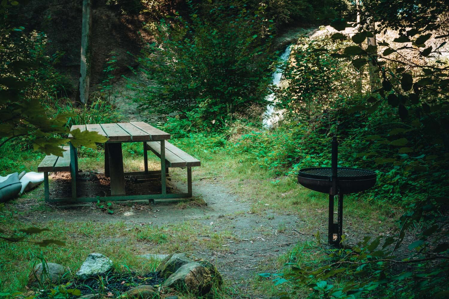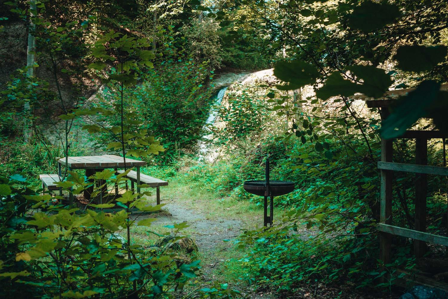 Beim oberen der beiden Bielbach-Fälle findet sich eine schöne Brätlistelle mit einem kleinen Grill und einem Picknicktisch, von dem aus sich ein toller Blick auf den Wasserfall bietet. Der Bach lädt die Kinder zum Planschen und Spielen ein – Gummistiefel nicht vergessen.
