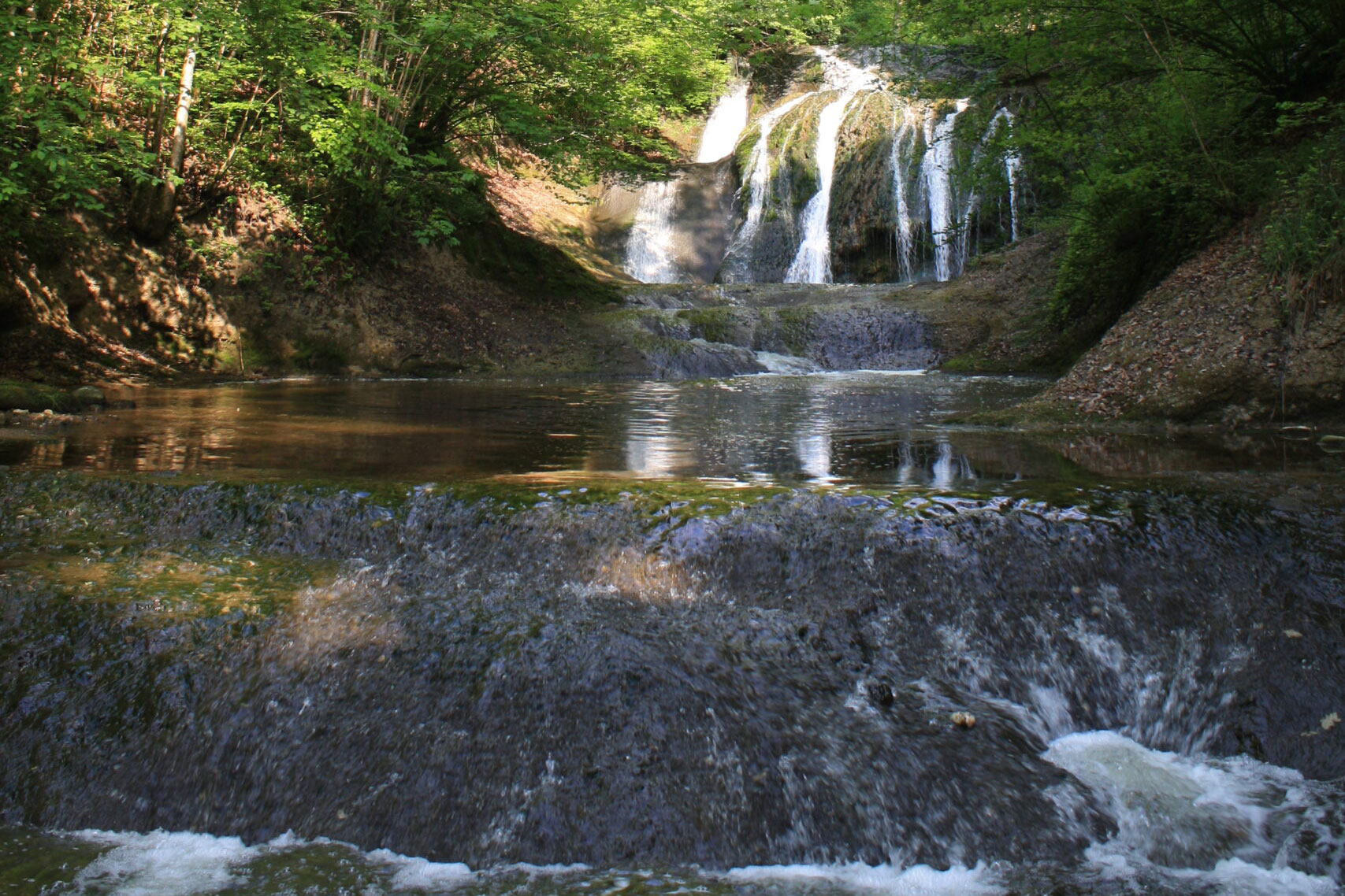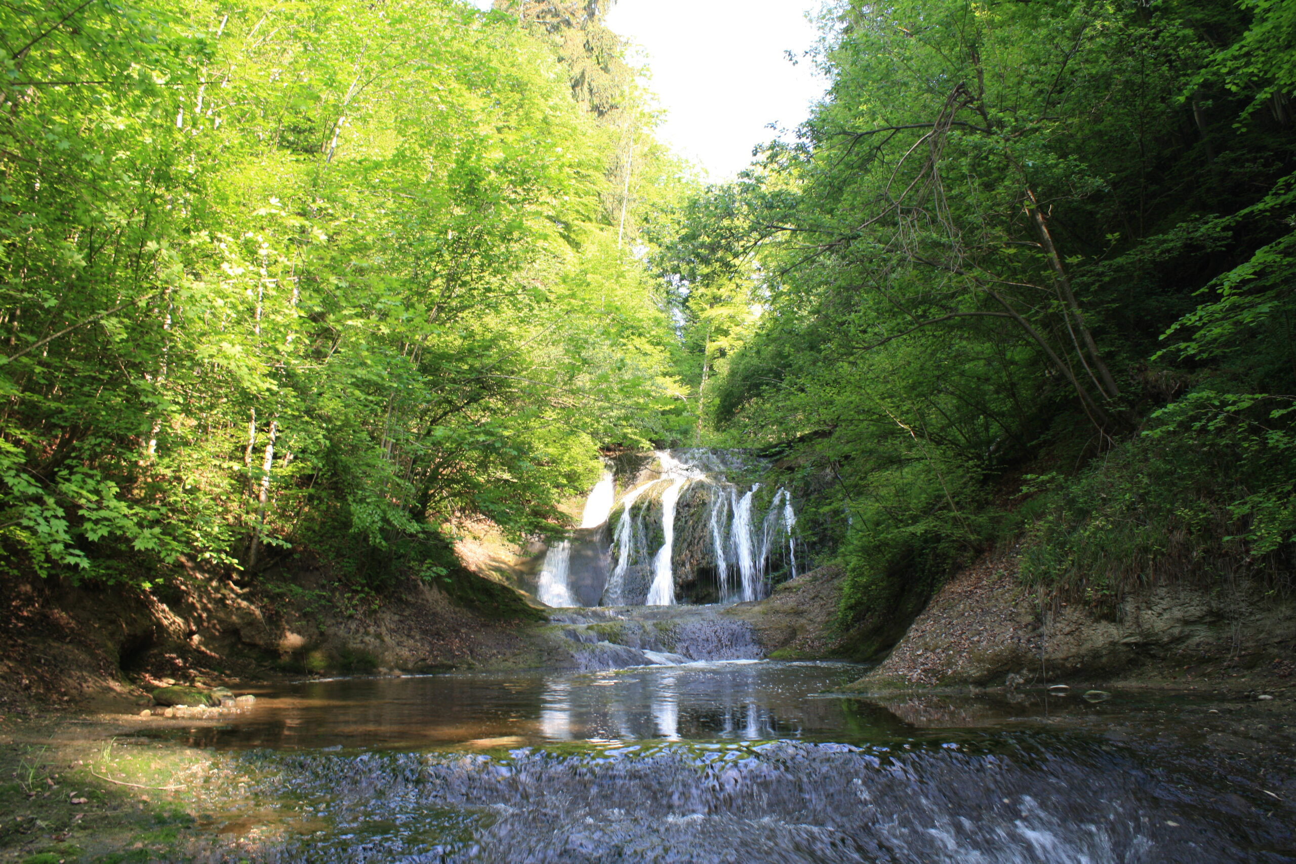Es gibt einen unteren und einen oberen Wasserfall – beide sind sehr sehenswert. Den unteren erreicht man über den schmalen Weg unterhalb des Fussballplatzes Blindei. Dort angelangt führt ein Weg oberhalb des Biotopes wieder Richtung Dorf.
