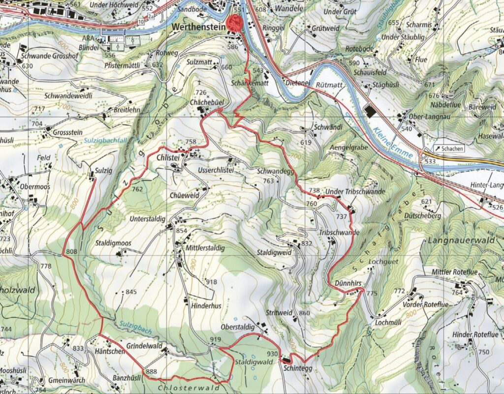 Vom Kloster geht es beim alten Schulhaus vorbei hinab zum Flussbett der Kleinen Emme. Auf dem Emmenuferweg angekommen führt der Weg weiter bis zum Bahnübergang. Dort geht es über die Langnauerbrücke und auf dem Veloweg wieder zurück Richtung Werthenstein. Nach dem Betrieb der Autoverwertung wird die Strasse überquert. Beim Aufstieg der steilen Strasse rückt die Hektik des Verkehrs in weite Ferne. Bei der Markierung links geht es hinunter zum Bächli, das sich bereit macht, über den Felsen zu stürzen. Die kleine Wanderung führt weiter dem Waldweg entlang über die Grütweid weiter bis zum Bauernhof Wandele. Dort gilt es linkerhand der Markierung bis hinunter zum Dorf Werthenstein zu folgen.