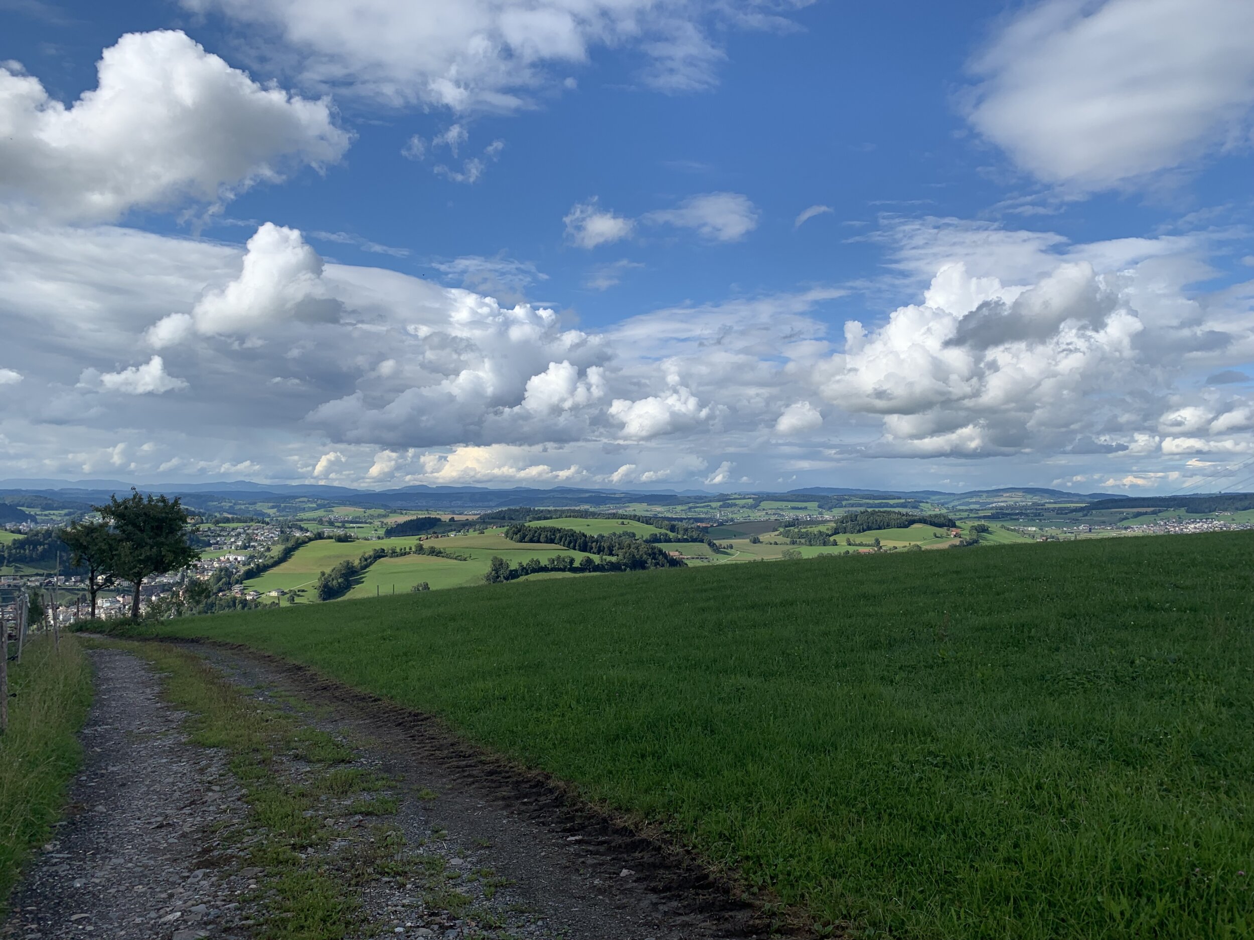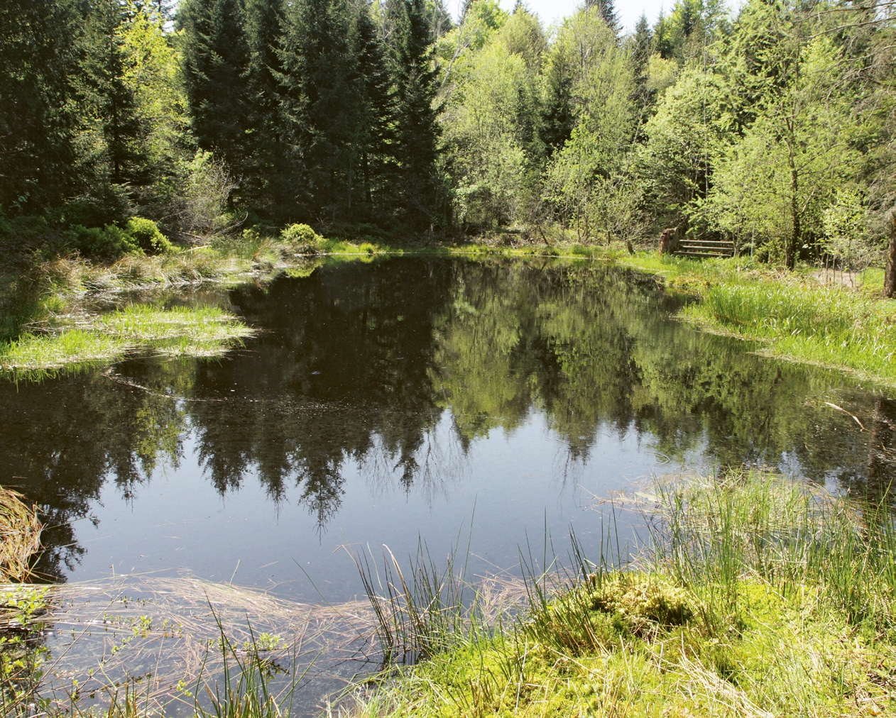 Die lange Weg-Variante ist zwar rund doppelt so weit, bietet dafür aber auch mehr Abwechslung. Der Weg links führt zuerst über Wiesen und dann hinauf auf die «Schintegg». Weiter geht es leicht abwärts durch den Chlosterwald, vorbei an einem idyllischen Waldweiher.